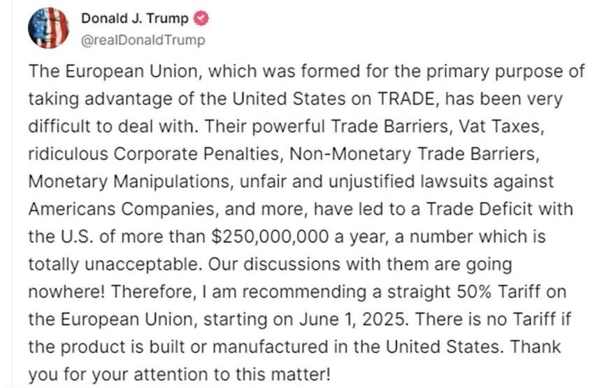 當(dāng)?shù)貢r(shí)間23日一早,美國總統(tǒng)特朗普在社交媒體上連發(fā)兩帖,矛頭分別對準(zhǔn)歐盟和蘋果。特朗普稱,歐盟“難打交道”“占美國便宜”,威脅自6月1日起對歐盟商品統(tǒng)一征收50%關(guān)稅;蘋果手機(jī)若不在美國生產(chǎn),應(yīng)面臨25%關(guān)稅。