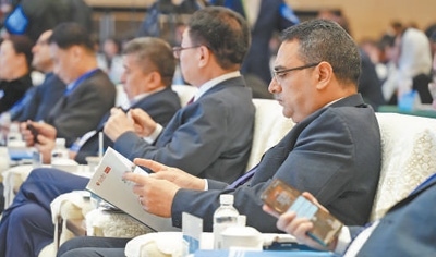 與會嘉賓在2025上合組織國家媒體合作論壇上,閱讀《共同的家園——上合組織成員國發(fā)展愿景民意調(diào)查報告》。