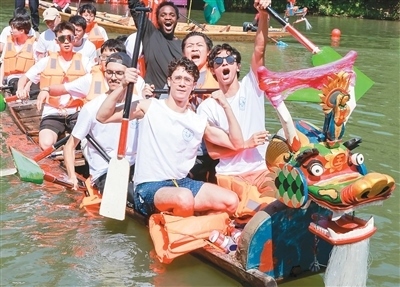去年,我參加了由杭州余杭區(qū)五常街道組織的龍舟體驗(yàn)營(yíng),親身感受競(jìng)渡帶來的“速度與激情”。我和同校好友組成隊(duì)伍,伴著耳邊觀眾的熱情歡呼揮槳出發(fā),濺起的水花在河道綻放。握槳、入水、拉水、出水、回槳……隨著龍舟劃至終點(diǎn),我們揮舞校旗、舉槳?dú)g呼。在龍舟運(yùn)動(dòng)中,我感受到了奮斗和團(tuán)結(jié)的力量——不同膚色的人們?cè)谕粭l水道上并肩奮進(jìn),這不正是“同舟共濟(jì)”的東方智慧嗎!