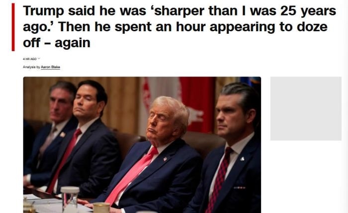 美國有線電視新聞網(wǎng)(CNN)注意到,當(dāng)美國商務(wù)部長盧特尼克談及貿(mào)易戰(zhàn)時,特朗普“似乎難以睜開眼睛”。在美國教育部長麥克馬洪和美國衛(wèi)生與公眾服務(wù)部長小羅伯特·肯尼迪發(fā)言時,特朗普“似乎僵住了,閉著眼睛,每次持續(xù)10到15秒,然后才轉(zhuǎn)動眼球或點(diǎn)頭”。