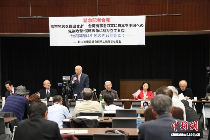 12月8日,日本多名學(xué)者及市民團(tuán)體代表在位于東京的日本參議院議員會(huì)館舉行記者會(huì),要求日本首相高市早苗撤回涉臺(tái)錯(cuò)誤言論。圖為“繼承和發(fā)展村山談話會(huì)”理事長(zhǎng)藤田高景發(fā)言。中新社記者 朱晨曦 攝