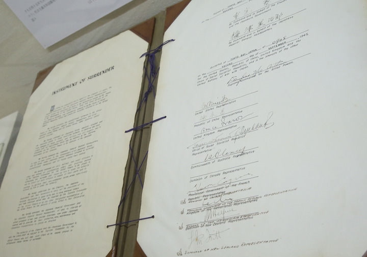 這是2015年9月1日在日本東京外務省外交史料館內拍攝的日本二戰(zhàn)無條件投降書原件。新華社記者 劉天 攝