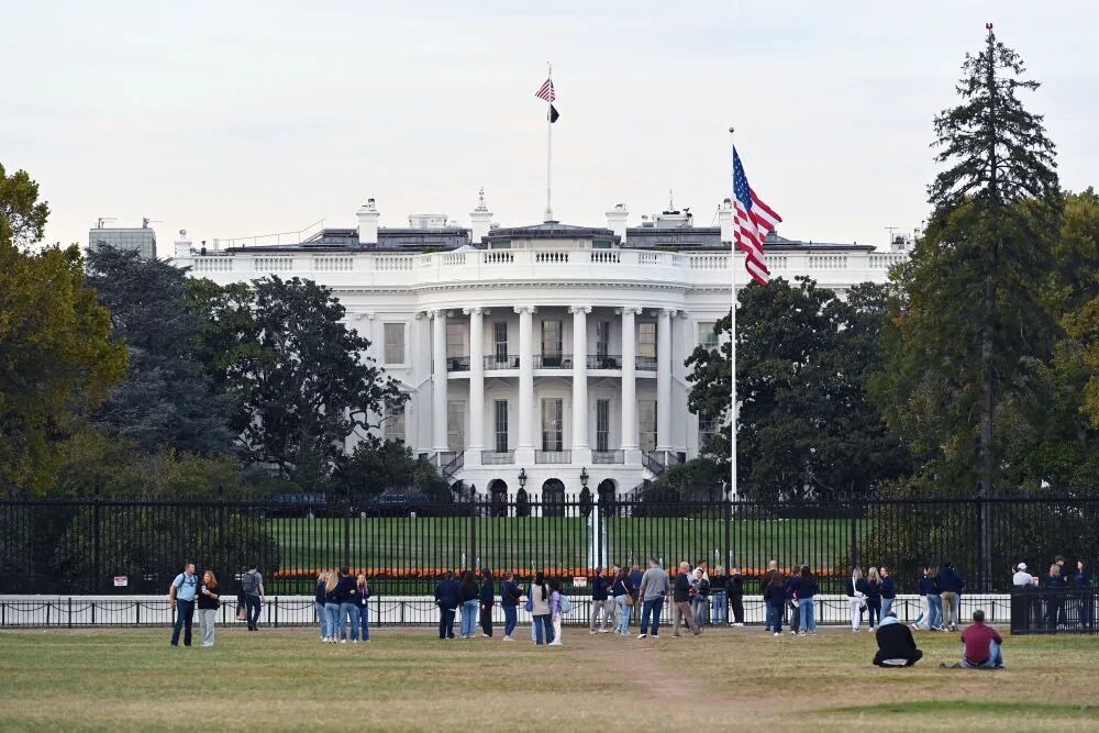 2025年10月21日,在美國華盛頓,人們在白宮前休閑。新華社記者李睿攝