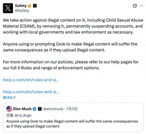 X表示,平臺(tái)會(huì)對(duì)非法內(nèi)容采取行動(dòng),包括刪除資料、封號(hào),并在必要時(shí)與執(zhí)法機(jī)構(gòu)展開(kāi)合作。馬斯克也在周末的一條帖子中強(qiáng)調(diào),任何使用“格羅克”制作非法內(nèi)容的人,將面臨與上傳非法內(nèi)容同樣的法律后果。