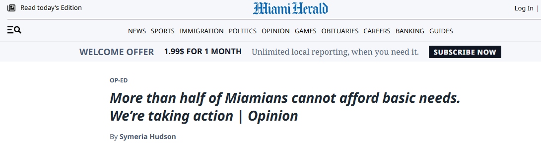 文章表示,在邁阿密,現(xiàn)實(shí)令人清醒:戴德縣超過五十萬個家庭難以負(fù)擔(dān)住房、食品、醫(yī)療、托兒、交通和技術(shù)等必需品和服務(wù)。家庭收入與實(shí)際生活成本之間的差距持續(xù)擴(kuò)大。西默里亞·哈德森在文中強(qiáng)調(diào),這些挑戰(zhàn)并非抽象概念。當(dāng)家庭被迫在支付房租和喂養(yǎng)孩子之間作出選擇時,這并非個人失敗,而是系統(tǒng)性問題。這需要企業(yè)領(lǐng)導(dǎo)者、政策制定者、教育者、醫(yī)療系統(tǒng)、非營利組織和普通公民共同努力。