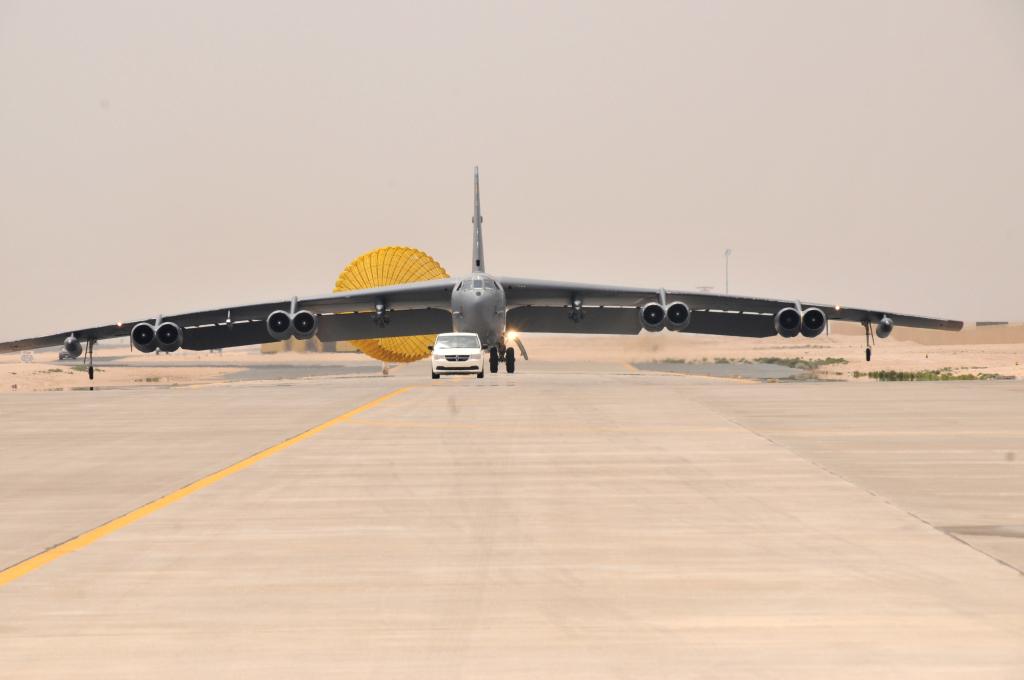 這張資料照片顯示的是2016年4月9日,一架美國空軍的B-52轟炸機(jī)抵達(dá)卡塔爾烏代德空軍基地。新華社/美聯(lián)
