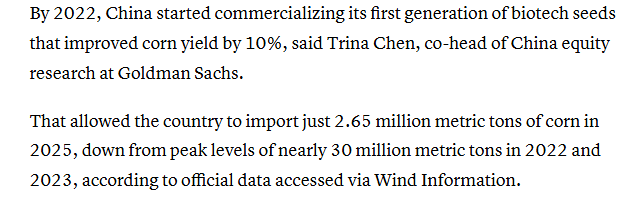 報(bào)道還稱(chēng),中國(guó)在農(nóng)業(yè)研究與開(kāi)發(fā)方面投入巨大,2019年至2021年其公共部門(mén)在這方面的支出大約是美國(guó)的兩倍。報(bào)道援引高盛中國(guó)股票研究部聯(lián)席主管的觀點(diǎn)稱(chēng),到2022年,中國(guó)已開(kāi)始將第一代生物育種產(chǎn)業(yè)化應(yīng)用,這些種子使玉米產(chǎn)量提高了10%。報(bào)道還援引萬(wàn)得資訊獲得的官方數(shù)據(jù)稱(chēng),這使得中國(guó)在2025年的玉米進(jìn)口量?jī)H為265萬(wàn)噸,遠(yuǎn)低于2022年和2023年近3000萬(wàn)噸的峰值水平。