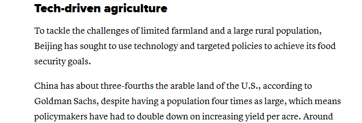 美國(guó)消費(fèi)者新聞與商業(yè)頻道援引高盛集團(tuán)的數(shù)據(jù)報(bào)道稱(chēng),中國(guó)擁有的耕地面積約為美國(guó)的四分之三,但人口是美國(guó)的四倍之多,這意味著中國(guó)的政策制定者必須加倍努力提高每畝土地的產(chǎn)量。