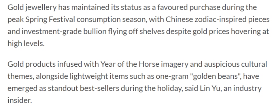 報道還稱,黃金珠寶在春節(jié)消費旺季持續(xù)保持熱門購買地位,盡管金價處于高位,但生肖主題設(shè)計的黃金飾品和投資級金條依然暢銷。報道援引業(yè)內(nèi)人士的話稱,融入馬年元素和吉祥文化主題的黃金產(chǎn)品,以及如一克“金豆”等質(zhì)量較輕的產(chǎn)品,在節(jié)日期間成為最暢銷的品類。