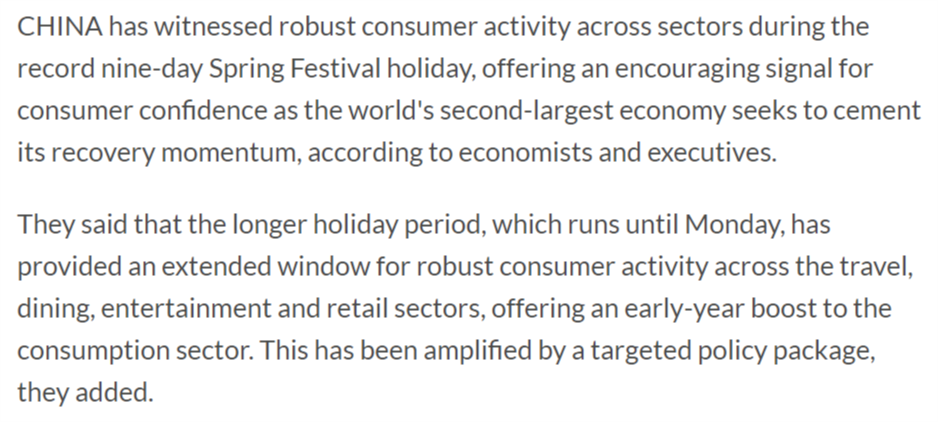 馬來西亞《星報》23日報道稱,在創(chuàng)紀(jì)錄的9天春節(jié)假期期間,中國各領(lǐng)域消費活動強(qiáng)勁,這為世界第二大經(jīng)濟(jì)體鞏固復(fù)蘇勢頭傳遞了積極信號,也彰顯了消費者信心。