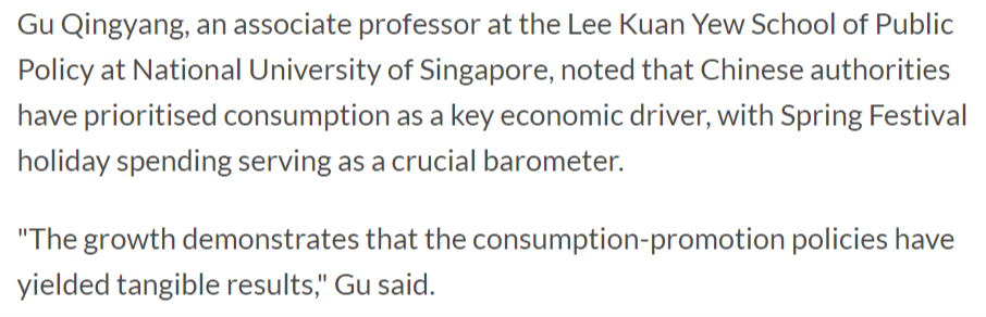 報道援引新加坡國立大學(xué)李光耀公共政策學(xué)院副教授顧清揚的話表示,中國政府已將消費列為關(guān)鍵的經(jīng)濟(jì)驅(qū)動力,春節(jié)假期消費則成為重要晴雨表。“增長表明促消費政策已取得切實成效。”