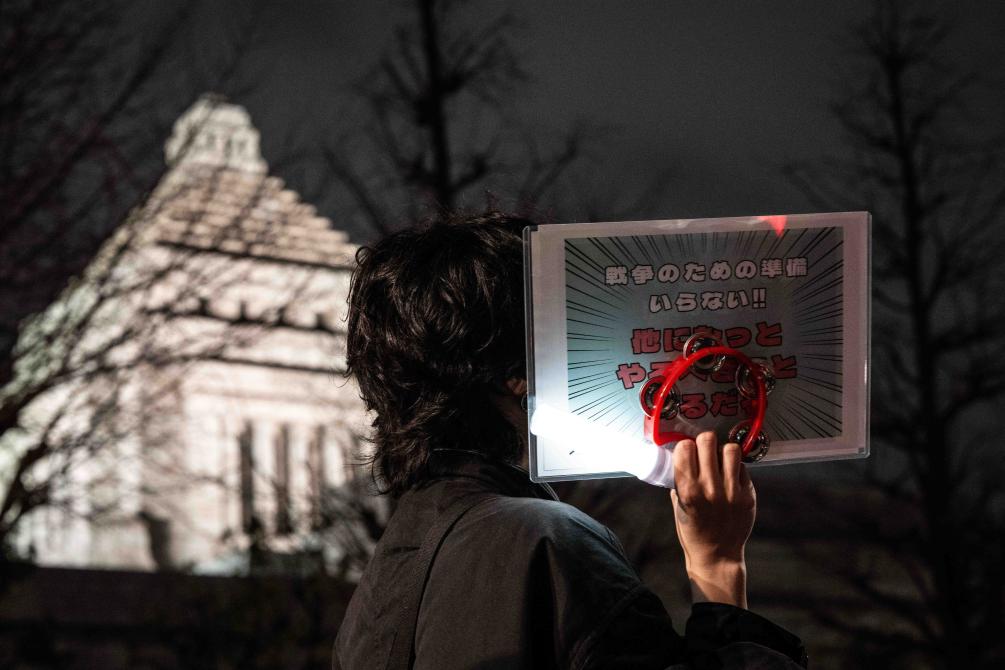 2月24日,在日本東京的眾議院第二議員會(huì)館前,民眾手持標(biāo)語(yǔ)參加抗議活動(dòng)。新華社記者賈浩成攝