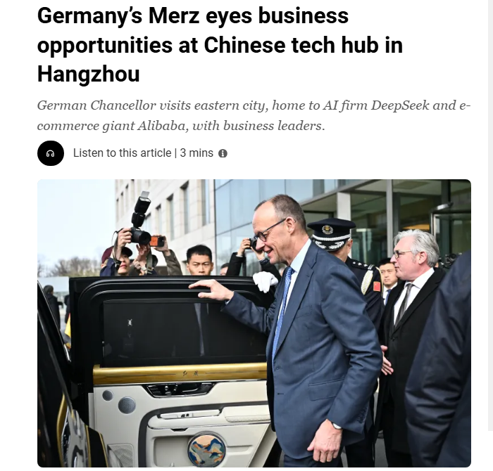 法國24新聞臺還關(guān)注了默茨在杭州的行程。報道稱,杭州聚集了多家中國大型科技公司,默茨參觀了中國的人形機器人企業(yè)。
