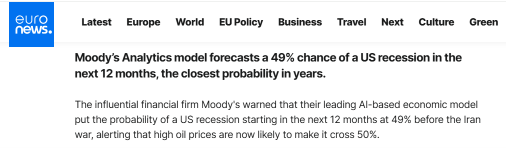 美政府接連出手的背后是疲軟的經(jīng)濟(jì)與通脹的預(yù)期無法承受高油價(jià)。而放任針對(duì)能源基礎(chǔ)設(shè)施的襲擊將進(jìn)一步威脅全球能源供應(yīng),推高油價(jià)。目前美國汽油價(jià)格已飆升至自2023年以來的最高水平,而據(jù)歐洲新聞臺(tái)3月18日?qǐng)?bào)道,穆迪分析(Moody's Analytics)模型預(yù)測,未來12個(gè)月內(nèi)美國經(jīng)濟(jì)陷入衰退的概率為49%,這是多年來最接近臨界點(diǎn)的一次。該模型還提醒稱,當(dāng)前高企的油價(jià)很可能使這一概率突破50%。