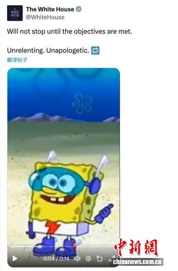 這是美國白宮社交媒體賬號截圖。該賬號發(fā)布的這段視頻中,海綿寶寶、電子游戲的歡快旋律與空襲伊朗的火光被剪輯在一起,視頻配發(fā)文字“不達(dá)目的不罷休”。