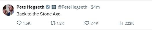 隨后,美國國防部長赫格塞思在社交媒體上發(fā)文,“回到石器時代”。