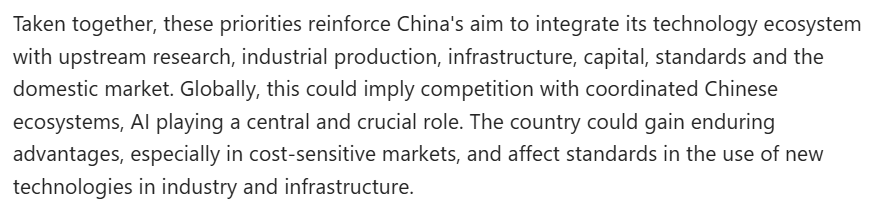 文章進一步分析說,這些優(yōu)先事項強化了中國將其技術生態(tài)系統(tǒng)與上游研究、工業(yè)生產(chǎn)、基礎設施、資本、標準及國內市場相融合的目標。對全球而言,這意味著未來將面對一個高度協(xié)同的中國技術生態(tài)系統(tǒng),而人工智能將是這一系統(tǒng)的中樞。中國由此可能獲得持久的競爭優(yōu)勢,同時也會在工業(yè)及基礎設施的新技術應用標準方面發(fā)揮越來越大的影響力。