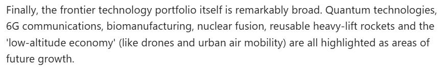 文章還注意到,當前,中國繼續(xù)要求在科學技術等多個領域取得突破。這意味著,中國需要在整個技術體系層面構建抗壓能力,而非依賴個別領域的孤立進展。此外,規(guī)劃綱要所涵蓋的前沿技術領域極為廣泛。量子技術、第六代移動通信技術、生物制造、核聚變、可復用重型運載火箭以及“低空經(jīng)濟”(包括無人機與城市空中交通)等,均被明確為未來發(fā)展的重點方向。