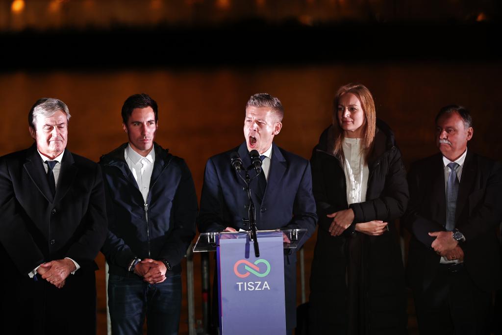 4月12日,在匈牙利首都布達(dá)佩斯,匈牙利蒂薩黨領(lǐng)導(dǎo)人毛焦?fàn)枴け说茫ㄖ校┰趧龠x晚會(huì)上講話(huà)。新華社發(fā)(鮑洛格·達(dá)維德攝)