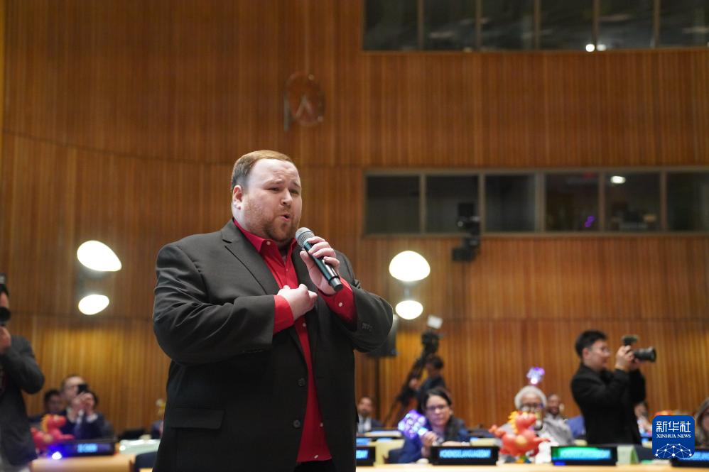 4月13日,在位于紐約的聯(lián)合國總部,美國歌唱家在聯(lián)合國中文日慶?;顒由涎莩段覑勰阒袊?。 新華社記者 張鳳國 攝