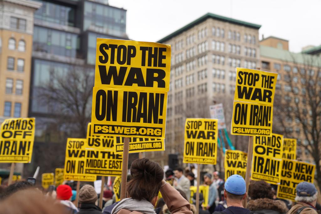 2026年3月7日,人們在美國紐約參加集會(huì)游行,抗議美國和以色列對伊朗發(fā)動(dòng)軍事打擊。新華社記者張鳳國攝