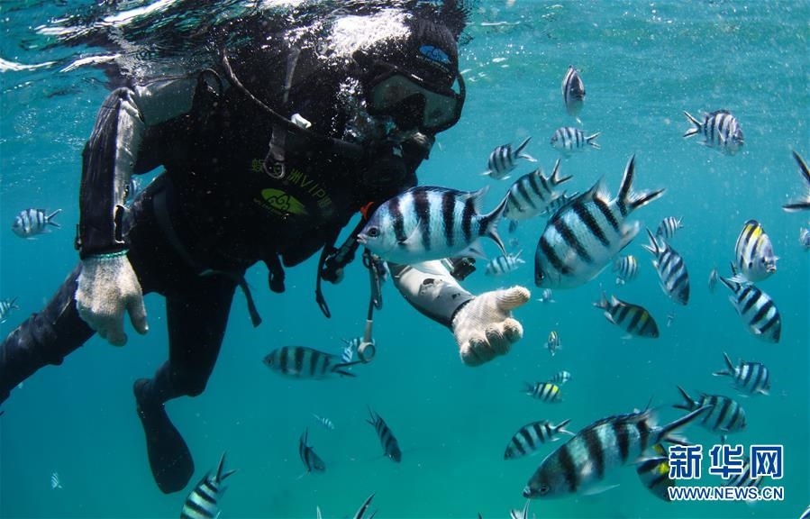 在海南三亞蜈支洲島海域拍攝的與??采男〕篝~(5月28日攝)。海南省三亞蜈支洲島海域海洋牧場是海南首個國家級海洋牧場示范區(qū),也是中國第一個位于熱帶地區(qū)的海洋牧場。近年來,蜈支洲島海域海洋牧場推進(jìn)海洋生態(tài)系統(tǒng)的恢復(fù)和保護(hù),先后開展了人工魚礁投放、海洋環(huán)境修復(fù)、珊瑚移植等工作。截至2019年底,蜈支洲島海域海洋牧場共投放各類人工魚礁1526塊、船礁21艘和一批火山石礁,共達(dá)4萬空立方米,礁區(qū)海域的漁業(yè)資源比非礁區(qū)要高5倍以上。目前,蜈支洲島海域海洋牧場已初現(xiàn)雛形。新華社記者楊冠宇攝