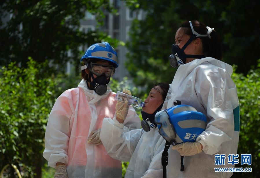 6月16日,北京藍(lán)天救援隊(duì)隊(duì)員在完成對豐臺(tái)區(qū)一居民區(qū)消殺作業(yè)后休息。連日來,北京出現(xiàn)高溫天氣??崾钪?,工作人員堅(jiān)守抗擊疫情一線,成為烈日下的“逆行者”。新華社發(fā)(陳鐘昊攝)