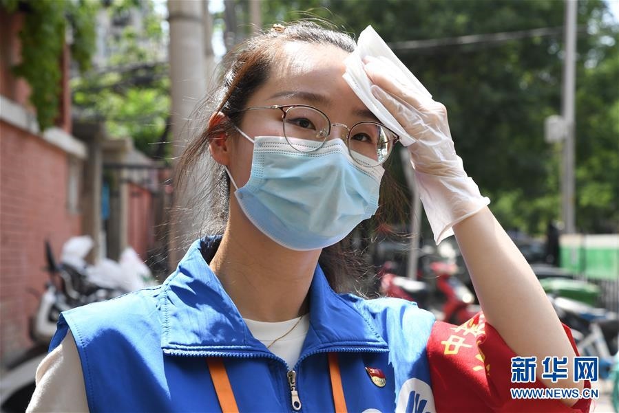 6月16日,在北京市海淀區(qū)中關(guān)村街道白塔庵社區(qū)出入口,疫情防控志愿者王玥在擦拭汗水。連日來,北京出現(xiàn)高溫天氣??崾钪?,工作人員堅(jiān)守抗擊疫情一線,成為烈日下的“逆行者”。新華社記者任超攝
