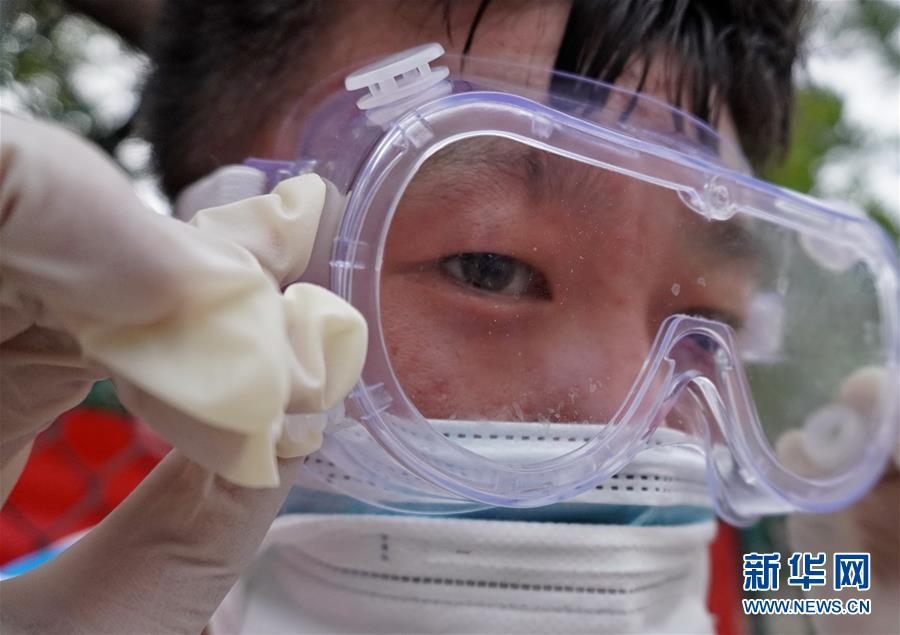 豐臺(tái)區(qū)東高地街道社區(qū)衛(wèi)生服務(wù)中心一位醫(yī)護(hù)人員的護(hù)目鏡內(nèi)流進(jìn)了汗水(6月15日攝)。連日來,北京出現(xiàn)高溫天氣。酷暑中,工作人員堅(jiān)守抗擊疫情一線,成為烈日下的“逆行者”。新華社記者李欣攝