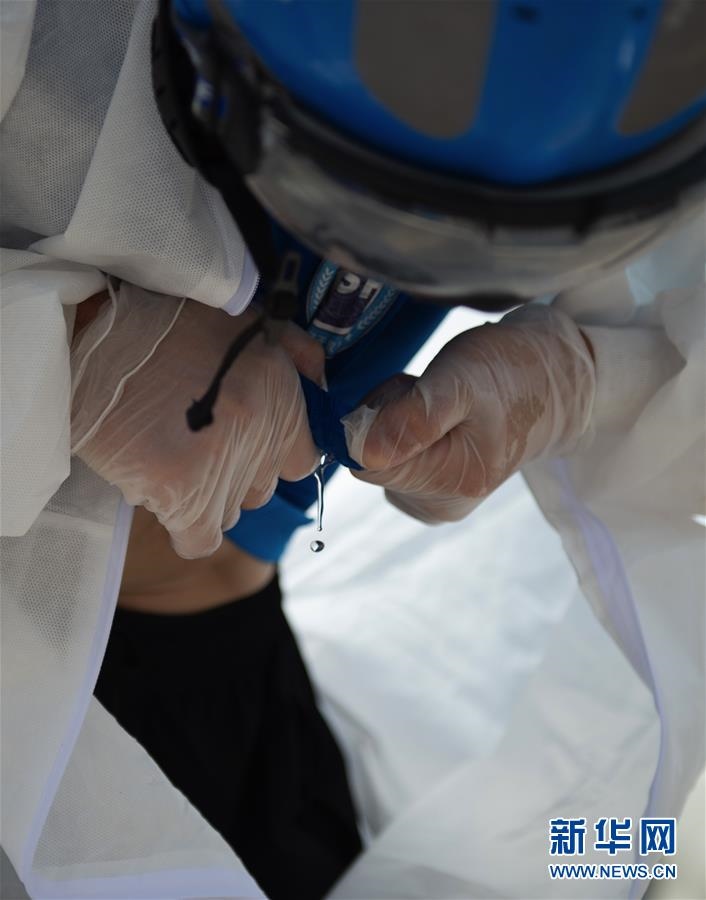 6月16日,北京藍(lán)天救援隊(duì)完成消殺任務(wù)后,一位隊(duì)員的衣服被擰出了汗水。連日來,北京出現(xiàn)高溫天氣??崾钪校ぷ魅藛T堅(jiān)守抗擊疫情一線,成為烈日下的“逆行者”。新華社發(fā)(陳鐘昊攝)