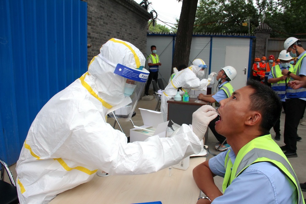 6月15日至17日,中建三局北京公司在京1042名職工做完核酸檢測,同時(shí)公司邀請專業(yè)機(jī)構(gòu)為在建項(xiàng)目的上萬名勞務(wù)工人、安保及物業(yè)管理人員提供上門核酸檢測。新華社發(fā)(柯玉乾攝)