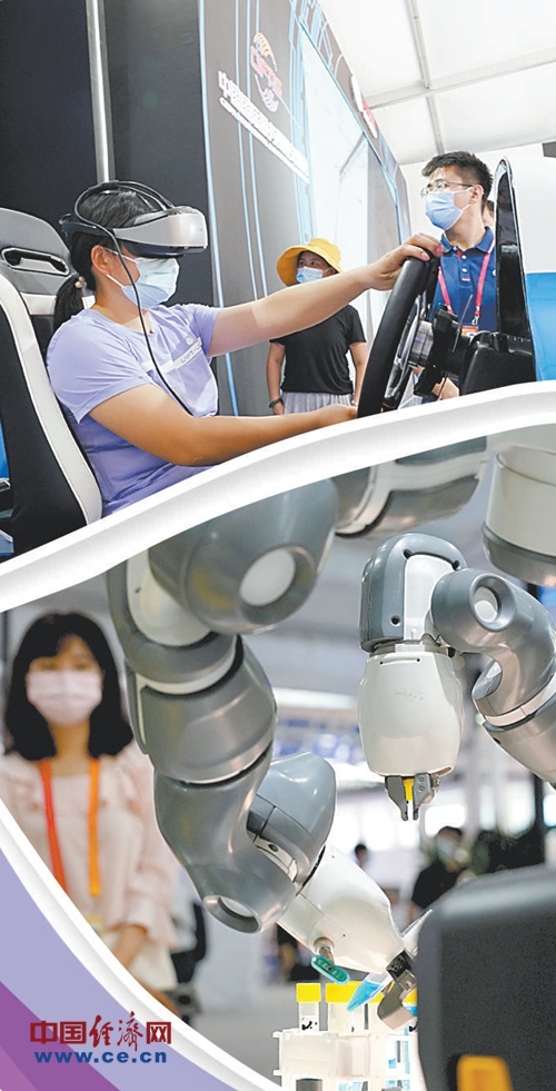 上圖:觀眾在2020服貿會5G通信服務展區(qū)體驗5G高速網(wǎng)絡帶來的仿真駕駛。下圖:觀眾在2020服貿會服務機器人展區(qū)參觀醫(yī)用機器人。經(jīng)濟日報-中國經(jīng)濟網(wǎng)記者趙晶攝