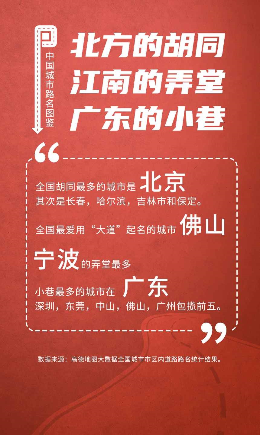 榜單顯示,人民路和建設路是全國重名率最高的道路,均有129個城市采用。此外,全國胡同最多的城市是北京;弄堂最多的城市是寧波;“小巷”最多的城市都在廣東省,深圳、東莞、中山、佛山和廣州包攬前五;“大道”最多的城市是佛山。