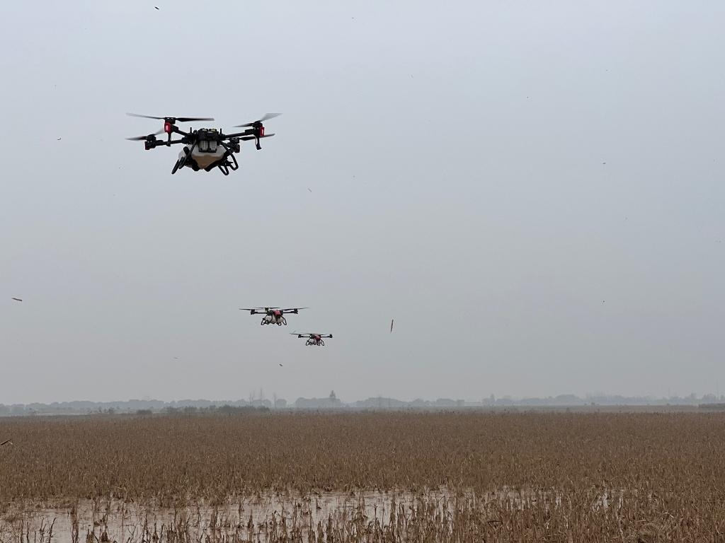 很快,渭南綠盛現(xiàn)代農(nóng)機(jī)專業(yè)合作社理事長(zhǎng)石宇峰就帶著3臺(tái)極飛農(nóng)業(yè)無(wú)人機(jī)來(lái)到地旁,準(zhǔn)備作業(yè)。記者看到,農(nóng)業(yè)無(wú)人機(jī)全程由專業(yè)人員操作,裝種、起飛,按規(guī)劃好的線路和高度在空中播撒,種子沒(méi)了再返航續(xù)加,幾個(gè)小時(shí)就完成了飛播。