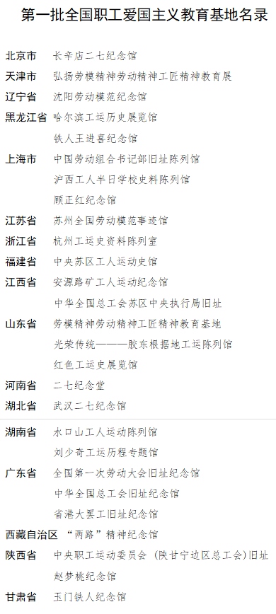 第一批全國職工愛國主義教育基地包括北京市長辛店二七紀(jì)念館、黑龍江省鐵人王進(jìn)喜紀(jì)念館、上海市中國勞動(dòng)組合書記部舊址陳列館、廣東省全國第一次勞動(dòng)大會(huì)舊址紀(jì)念館、陜西省中央職工運(yùn)動(dòng)委員會(huì)(陜甘寧邊區(qū)總工會(huì))舊址等27家單位。旨在進(jìn)一步加強(qiáng)紅色工運(yùn)資源的保護(hù)挖掘和宣傳利用,引領(lǐng)各級(jí)工會(huì)努力把紅色工運(yùn)資源建設(shè)成為開展黨史學(xué)習(xí)教育的重要陣地,打造成愛國主義教育、革命傳統(tǒng)教育、加強(qiáng)職工思想政治引領(lǐng)的生動(dòng)課堂,團(tuán)結(jié)引導(dǎo)廣大職工群眾更好傳承紅色基因、賡續(xù)紅色血脈、汲取奮進(jìn)力量。第一批全國職工愛國主義教育基地在中國工運(yùn)史上影響重大,代表性強(qiáng)、知名度高,現(xiàn)有的設(shè)施建設(shè)和保護(hù)利用較好,符合時(shí)代要求,具有較強(qiáng)的示范引領(lǐng)作用。