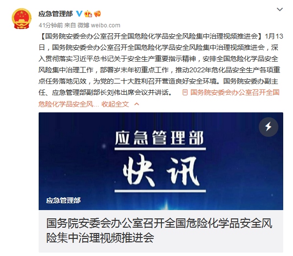 1月13日,國務(wù)院安委會(huì)辦公室召開全國危險(xiǎn)化學(xué)品安全風(fēng)險(xiǎn)集中治理視頻推進(jìn)會(huì),安排全國危險(xiǎn)化學(xué)品安全風(fēng)險(xiǎn)集中治理工作,部署歲末年初重點(diǎn)工作,推動(dòng)2022年危化品安全生產(chǎn)各項(xiàng)重點(diǎn)任務(wù)落地見效,為黨的二十大勝利召開營造良好安全環(huán)境。