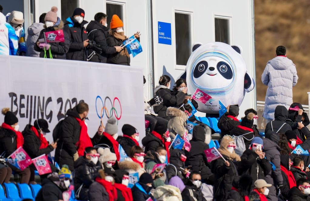 2月6日,2022年北京冬奧會越野滑雪男子雙追逐(15公里傳統(tǒng)技術+15公里自由技術)比賽,吉祥物“冰墩墩”在現(xiàn)場與觀眾互動。新華社記者劉潺攝