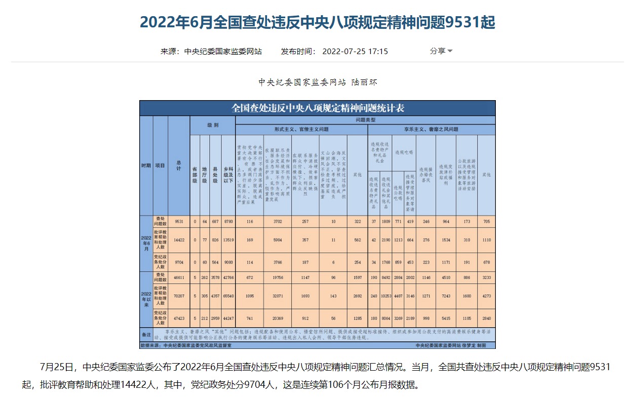 從公布的月報數(shù)據(jù)看,當月(6月),全國共查處違反中央八項規(guī)定精神問題9531起,批評教育幫助和處理14422人,其中,黨紀政務處分9704人。