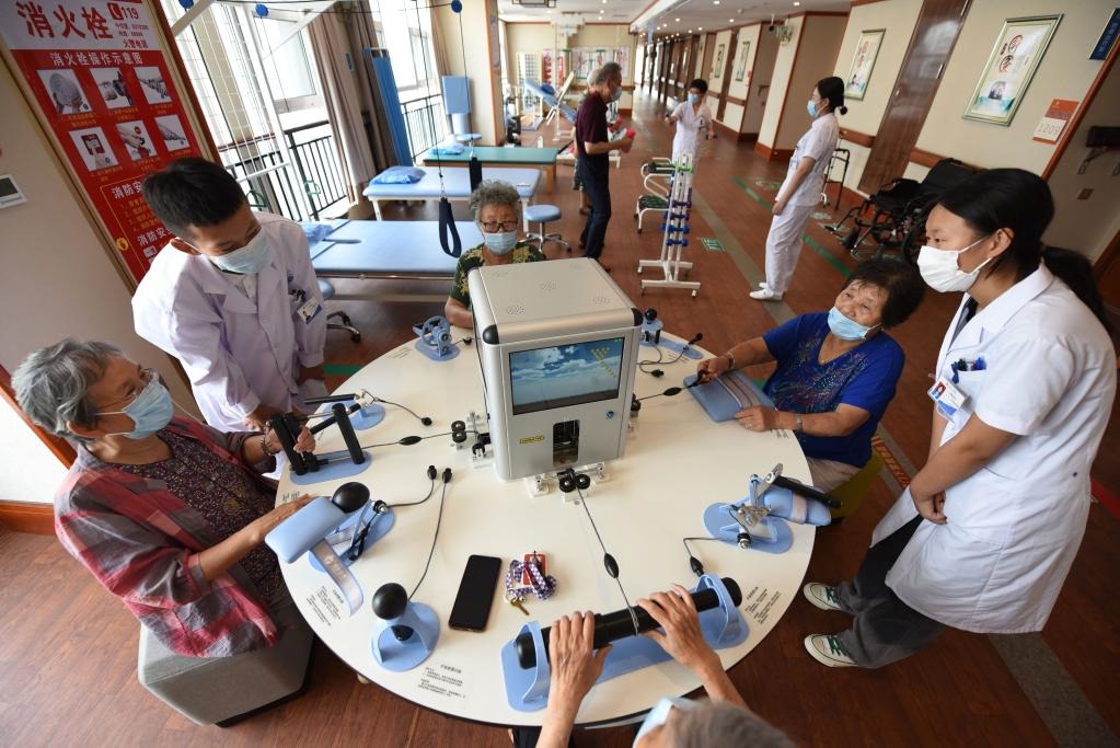 8月5日,在山東日照頤養(yǎng)公寓,醫(yī)生指導(dǎo)老人通過手功能綜合康復(fù)訓(xùn)練平臺進(jìn)行手指鍛煉。新華社記者范長國攝