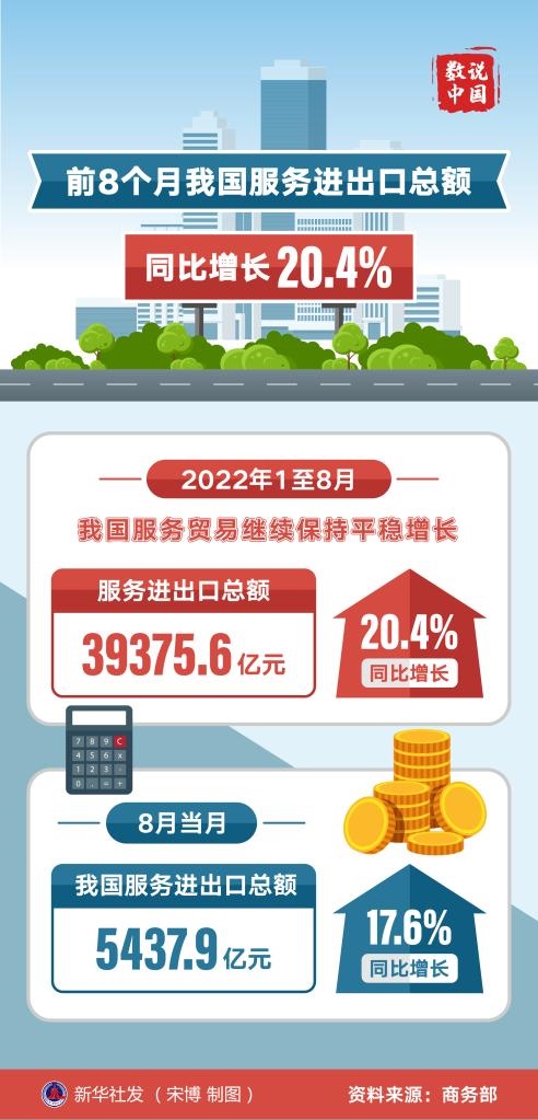 新華社北京10月12日電(記者謝?,帲┥虅?wù)部12日公布數(shù)據(jù)顯示,今年1至8月,我國服務(wù)貿(mào)易繼續(xù)保持平穩(wěn)增長。服務(wù)進(jìn)出口總額39375.6億元,同比增長20.4%。