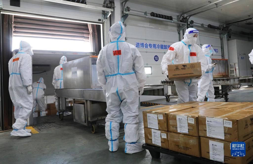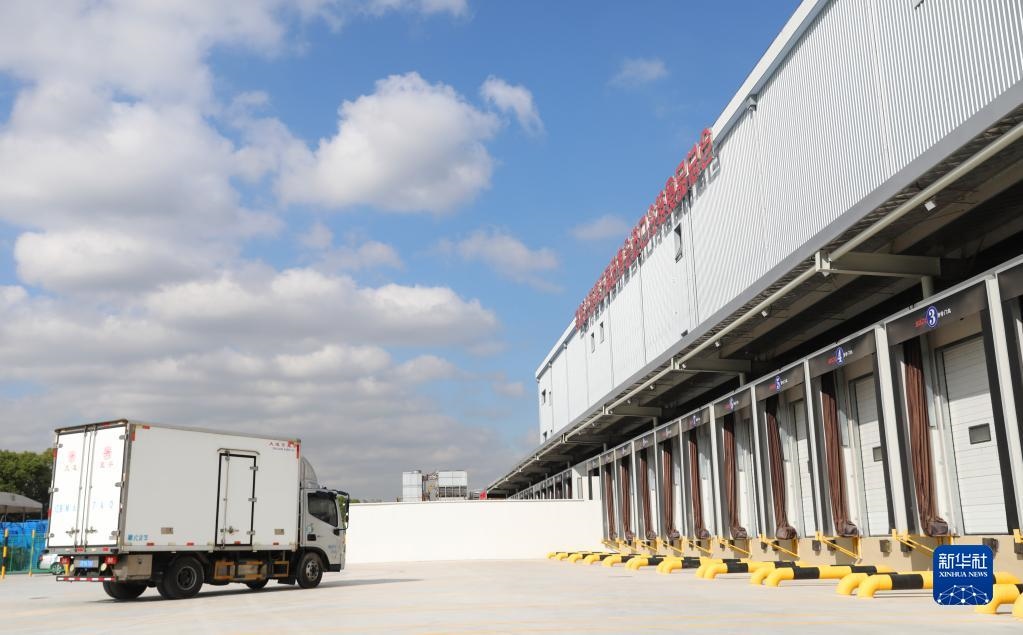 10月20日,裝載第一批進(jìn)口冷鏈?zhǔn)称氛蛊返目ㄜ囻側(cè)肟倐}卸貨區(qū)域。新華社記者 方喆攝