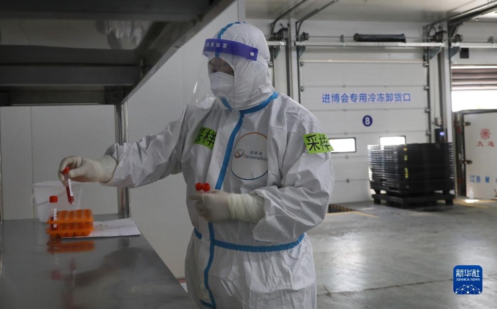 10月20日,一名核酸采樣工作人員在放置入倉的冷鏈?zhǔn)称氛蛊泛怂針颖?。新華社記者 方喆攝