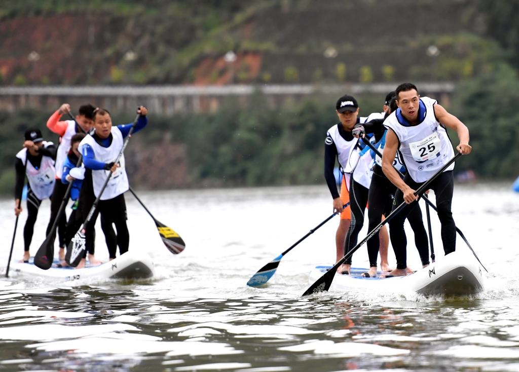 2018年11月18日,參賽選手在槳板團體賽決賽中。當(dāng)日,2018年中國·將樂國際皮劃艇槳板馬拉松公開賽在福建省將樂縣落幕。新華社記者彭張青攝