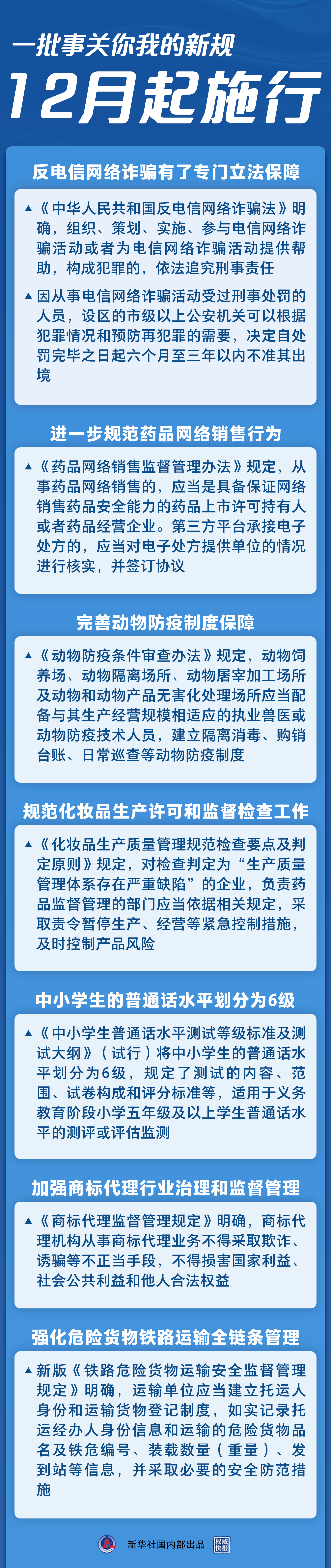 2022年的最后一個月,一批事關(guān)你我的新規(guī)開始施行。反電信網(wǎng)絡(luò)詐騙有了專門立法保障,中小學生的普通話水平有了規(guī)范標準,藥品網(wǎng)絡(luò)銷售平臺責任進一步壓實……法治,為美好生活助力。