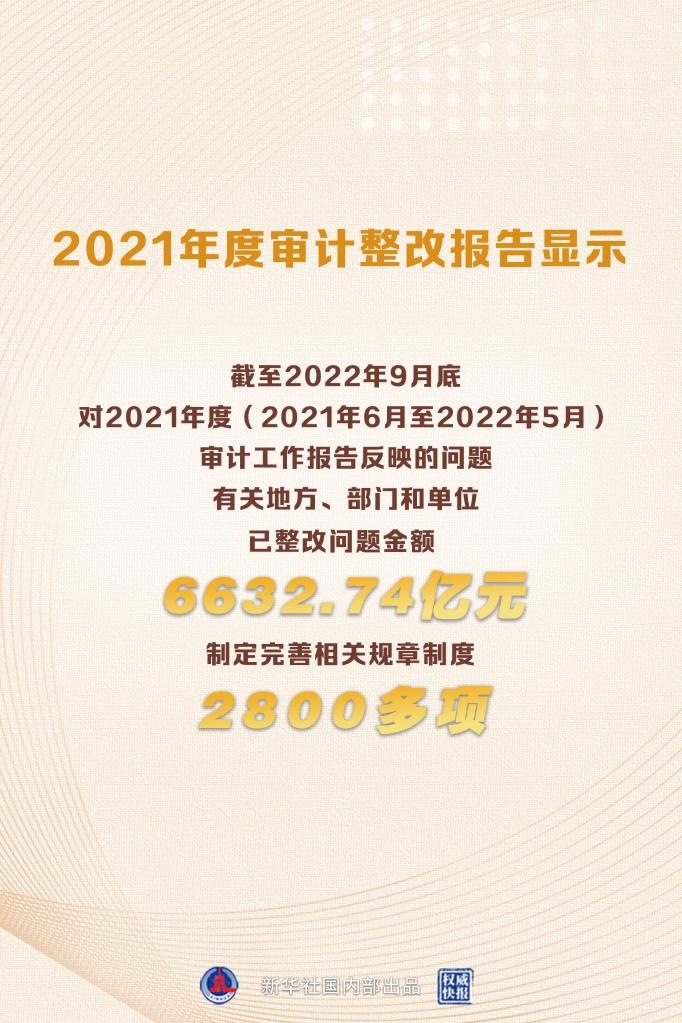 新華社北京12月28日電(記者鄒多為)報(bào)告顯示,截至2022年9月底,對(duì)于2021年度(2021年6月至2022年5月)審計(jì)工作報(bào)告反映的問題,有關(guān)地方、部門和單位已整改問題金額6632.74億元,制定完善相關(guān)規(guī)章制度2800多項(xiàng),追責(zé)問責(zé)1.4萬人,糾治了一些阻礙改革發(fā)展和長(zhǎng)期未解決的頑瘴痼疾。