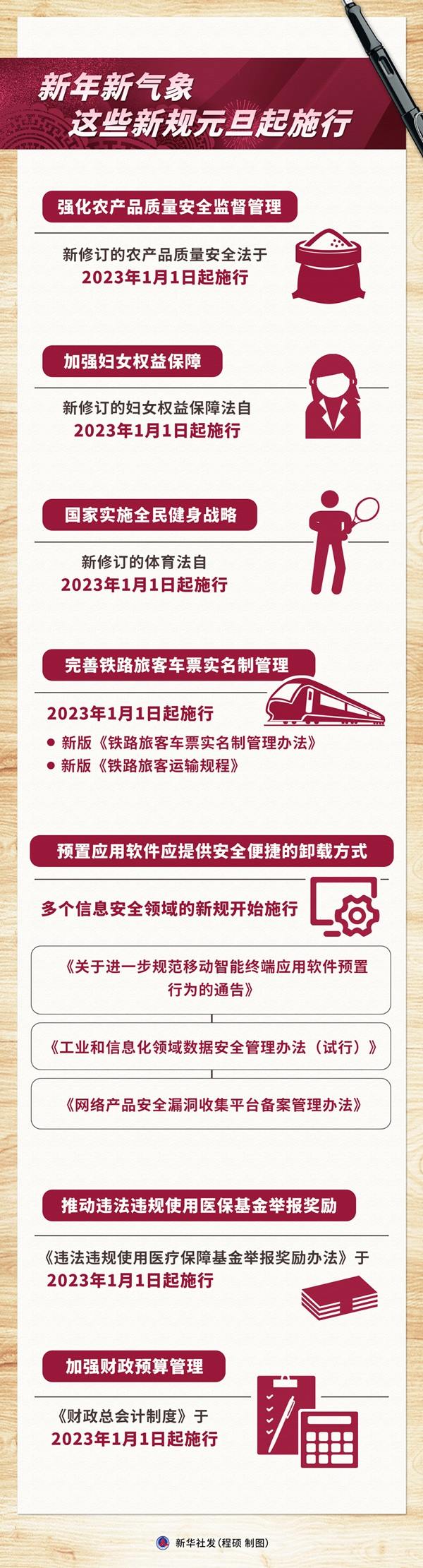當2023年的鐘聲敲響,一批元旦起施行的新規(guī),將為我們帶來新年新氣象。新修訂的農產品質量安全法全鏈條保障“舌尖上的安全”;新修訂的婦女權益保障法進一步促進男女平等;新修訂的體育法構建全民健身公共服務體系……法治的溫度,彰顯社會的進步。