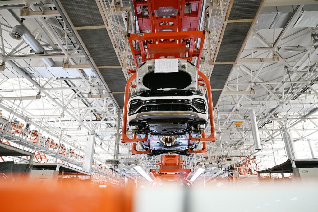 在天津經(jīng)濟(jì)技術(shù)開(kāi)發(fā)區(qū)一汽-大眾華北基地,車輛在生產(chǎn)線上等待裝配零部件(2022年6月15日攝)。新華社記者 李然 攝