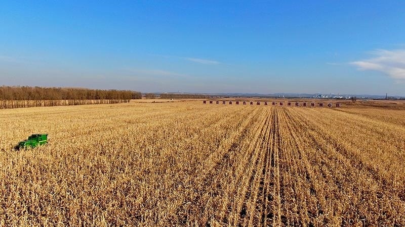 △2022年10月28日,在四平市梨樹縣國家百萬畝綠色食品原料(玉米)標準化生產(chǎn)基地核心示范區(qū),農(nóng)民駕駛農(nóng)機進行秋收作業(yè)。