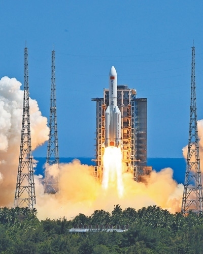 搭載問天實驗艙的長征五號B遙三運載火箭,在海南文昌航天發(fā)射場點火發(fā)射。 新華社記者 李 剛攝