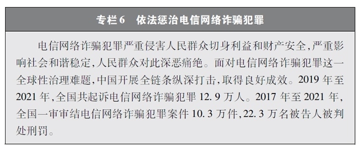 加大網(wǎng)絡(luò)犯罪懲治力度。隨著互聯(lián)網(wǎng)技術(shù)的快速發(fā)展,傳統(tǒng)犯罪加速向以互聯(lián)網(wǎng)為媒介的非接觸式犯罪轉(zhuǎn)變,電信網(wǎng)絡(luò)詐騙、網(wǎng)絡(luò)賭博、網(wǎng)絡(luò)淫穢色情等涉網(wǎng)違法犯罪多發(fā)。中國依法辦理新型網(wǎng)絡(luò)犯罪案件。連續(xù)多年開展“凈網(wǎng)行動”,嚴(yán)厲打擊群眾反映強(qiáng)烈的黑客攻擊破壞、侵犯公民個人信息等違法犯罪活動。持續(xù)推進(jìn)“云劍”“斷卡”“斷流”“拔釘”等專項(xiàng)行動,打擊套路貸、校園貸、“以房養(yǎng)老”、“投資養(yǎng)老”等電信網(wǎng)絡(luò)詐騙犯罪,依法懲處為電信網(wǎng)絡(luò)詐騙犯罪團(tuán)伙提供互聯(lián)網(wǎng)接入、域名注冊、服務(wù)器托管、移動互聯(lián)網(wǎng)應(yīng)用程序制作開發(fā)、網(wǎng)絡(luò)支付、引流推廣等服務(wù)支撐的黑灰產(chǎn)業(yè)。完善國家反詐大數(shù)據(jù)平臺和反詐移動互聯(lián)網(wǎng)應(yīng)用程序,建設(shè)國家涉詐黑樣本庫,完善快速止付凍結(jié)機(jī)制、涉詐資金返還機(jī)制。堅(jiān)決打擊網(wǎng)絡(luò)賭博犯罪行為,從嚴(yán)治理網(wǎng)絡(luò)淫穢色情。網(wǎng)絡(luò)犯罪治理工作取得明顯成效,人民群眾安全感有效提升,社會更加和諧穩(wěn)定。